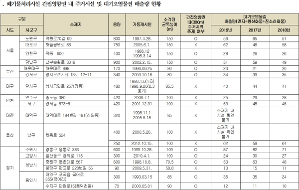 서울의 경우 노원구와 마포구, 양천구, 강남구에 소각시설이 하나씩 있다. 이 시설들이 지난해 배출한 대기오염물질(먼지, 황산화물, 질소산화물)은 노원구 51t, 마포구 58t, 양천구 26t, 강남구 49t 등 총 184t이다.
