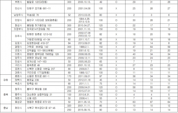 65곳의 소각시설을 지역별로 살펴보면 경기가 23곳으로 가장 많고 경남 8곳, 충남 6곳, 충북 5곳, 서울 4곳, 강원·경북 각각 3곳, 부산·인천·울산·전북·제주 각각 2곳, 대구·대전·전남 각각 1곳 순이다.