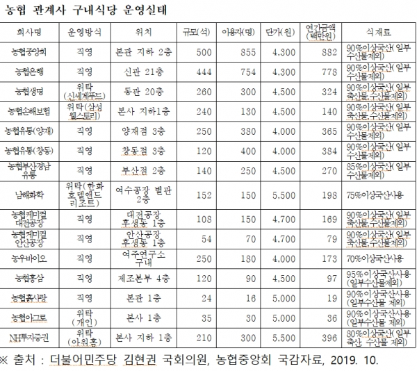 국회 농림해양축산식품위원회 소속 더불어민주당 김현권 의원(구미을지역위원장)에 따르면 농협중앙회, 농협은행 등 15개 농협 관계사들의 구내식당 운영현황을 조사한 결과 전체 구매시당 급식규모 43억원 가운데 11억원 어치를 신세계푸드, 삼성웰스토리, 아워홈, 한화호텔앤드리조트 등 급식사업을 펼치고 있는 외식 대기업들에게 위탁한 것으로 나타났다. 이는 2개마을 109농가의 농업소득액과 맞먹는 규모다.
