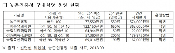 우선 농진청은 4,000원이 넘는 급식단가에다, 식당 운영인력을 자체적으로 갖추고 있었다. 특히 국산 위주의 식재료 조달 체계를 통해서 양질의 급식을 공급하고 있는 것으로 나타났다.