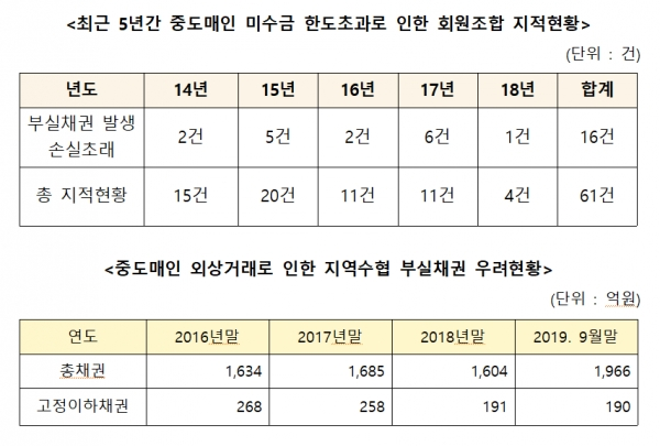 김현권 의원이 수산업협동조합중앙회로부터 제출받은 ‘중도매인 외상 한도초과 관련 회원조합에 대한 감사현황’에 따르면, 지역조합별 중도매인 약정 외상거래 한도 초과가 269건이 적발됐으며 약 135억원의 한도초과액이 발생하였다. 또한 16건에 대한 37억원이 손실처리 된 사실이 드러났다.