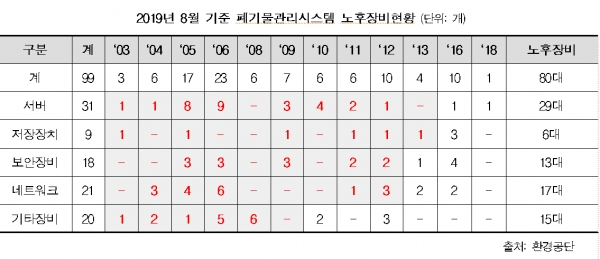 폐기물관리(Allbaro)시스템 장비 중 서버는 31대 중 29대(93.5%), 저장장치는 9대 중 6대(66.7%), 보안장비는 18대 중 13대(72.2%), 네트워크장비는 21대 중 17대(81.0%), 기타장비는 20대 중 15대(75.0%)가 내용연수가 경과된 상태로 운영되고 있는 것으로 나타났다.