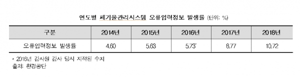 감사원은 2017년 ‘국토·환경분야 정보시스템 구축 및 활용실태’ 특정감사보고서를 통해 매년 오류입력정보 발생률이 증가하는데도 폐기물 처리정보가 정확히 관리되지 아니하여 폐기물 추적이 제대로 안 되고 있다고 지적한 바 있다. 감사원 감사 당시 5.73%로 지적받았던 오류발생률은 현재 10.72%까지 올라간 상태이다.
