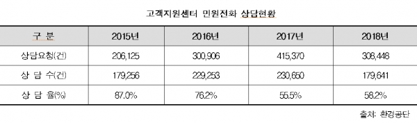 환경공단은 폐기물관리시스템 관련하여 별도로 고객지원센터를 구성하여 민원전화 상담을 지원하고 있으나 민원전화 상담률 또한 2015년 87.0%에서 2016년 76.2%, 2017년 55.5%, 2018년 58.2%로 매년 감소하고 있어 올바로시스템을 이용하는 폐기물업체들의 불편이 가중되고 있다.