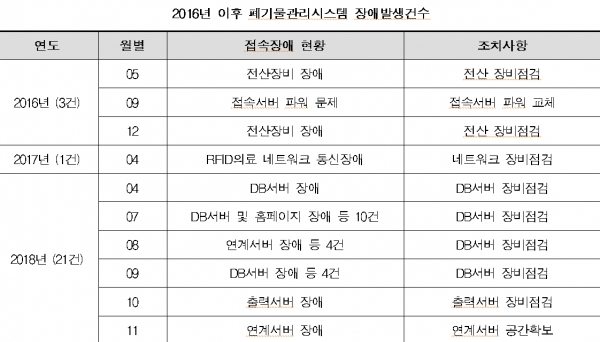 폐기물관리(Allbaro)시스템 장애발생건수는 2016년 3건, 2017년 1건, 2018년 21건으로 늘어났으며, 시스템 관리오류발생률도 2016년 5.73%에서 2017년 8.77%, 2018년 10.72%까지 급격히 증가하고 있다.