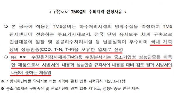 공단이 조달청에 송부한 「세종시 연동·부강면 공공하수처리시설 TMS설비 설치사업」 발주계획을 보면, ‘㈜ㅇㅇ’를 수의계약 업체로 선정한 사유에 대해 첫째, 「중소기업제품 구매촉진 및 판로지원에 관한 법률」 제15조에 따라 성능인증(COD, T-N, T-P)을 획득한 업체이고, 둘째, 시방서의 내용과 성능인증 규격서의 내용을 대비 검토한 결과 시방서의 내용에 준하는 제품이라는 것이었다.