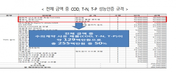 또한 COD, T-N, T-P 등 성능인증 제품 가격이 전체 계약금액의 50% 정도 밖에 안됐기 때문에 이를 사유로 전체 물품을 일괄적으로 계약하는 것은 적합하지 않고, 성능인증제품이 아닌 물품은 분리발주하는 것이 바람직했다.
