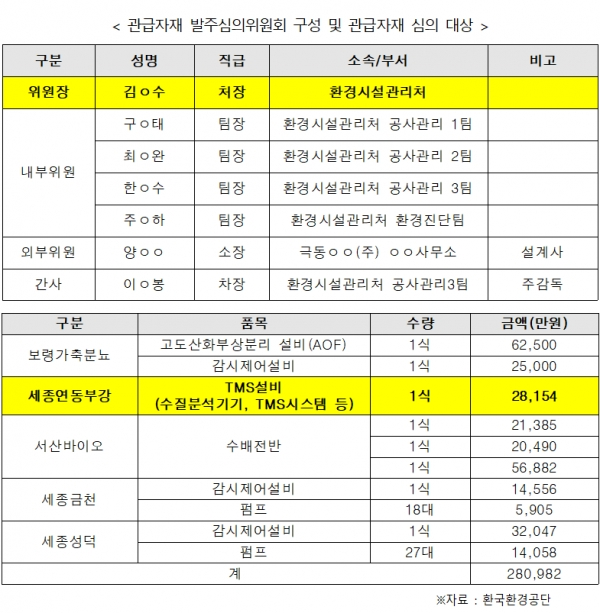 당시 관급자재 심의위원회는 「세종시 연동·부강면 공공하수처리시설 TMS설비 설치사업」에 대해 국정감사 당시 지적됐던 업체인 ‘(주)ㅇㅇ’를 수의계약 업체로 선정하고 11월 7일 대전지방조달청(이하 조달청)에 조달 요청했다.