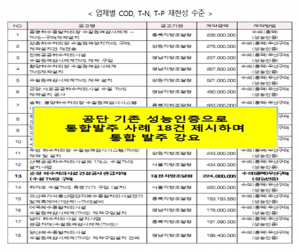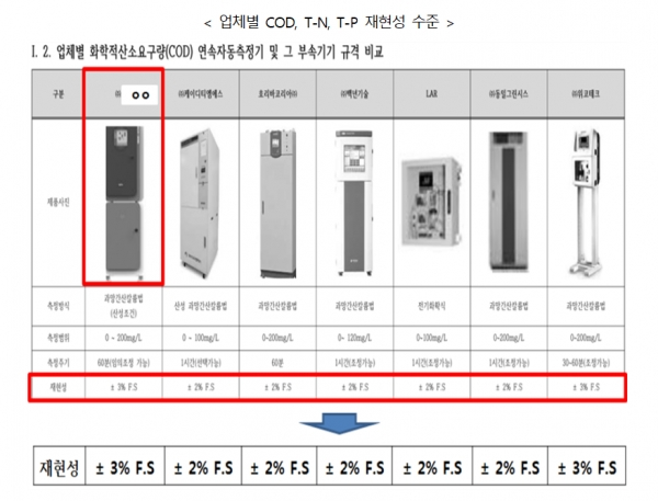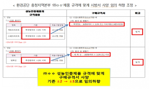 이후 공단은 11월 19일 조달청에 ‘㈜ㅇㅇ’의 성능인증제품 규격과 시방서 구매규격의 비교표를 제출함. 그런데 공단이 제출한 비교표를 보면 ‘㈜ㅇㅇ’의 성능인증 규격에 맞게 기존 시방서의 COD, T-N, T-P 재현성 등 사양을 오히려 ±3%로 임의 하향조정하여 제출했다.