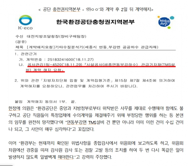 그런데 한국환경공단은 국회 지적 단 4일 후 관련 업체와 부정당하고 부적절 방법으로 수의계약을 강행한 것이 드러났다.