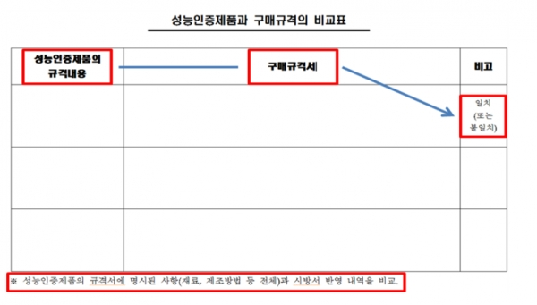 이에 조달청도 11월 8일 회신 공문을 통해 공단이 보내온 시방서와 수의계약 사유인 성능인증제품의 규격이 맞지 않으니 시방서와 성능인증제품의 규격을 비교표로 만들어 보내도록 하고, 해당 규격이 다를 경우 성능인증제품으로 인정할 수 없어 수의계약 자체가 불가능하다고 통보