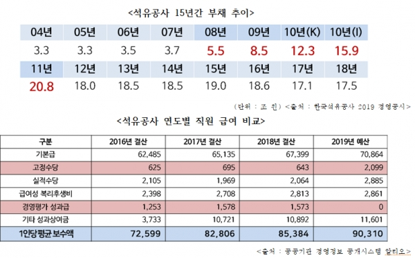 ‘한국석유공사 2019 경영공시 및 Alio’, ‘2018 외부회계감사보고서’를 분석한 결과 2007년 3조 원대 부채에서 2008년 5.5조 원, 2010년 12.3조 원, 2011년 20.8조 원 등으로 늘어나 2018년 현재 17.5조 원으로, 현재 부채가 차지하는 비율이 2,287%일 정도로 심각한 상황임이 밝혀졌다.