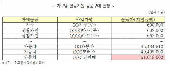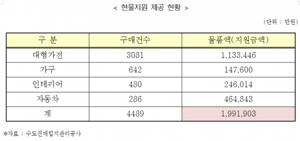 실제 ‘현물지원 제공 현황’ 자료를 분석해본 결과 233억 중 199억(85%)이 대기업 물품 구매에 쏠린 것을 확인했다. 가전, 가구, 인테리어에 지원금을 사용한 건수만 4213건 지원금은 152억에 달했고, 한 번에 큰 비용이 들어가는 차량구매는 289건 지원금은 총 46억에 달했다.