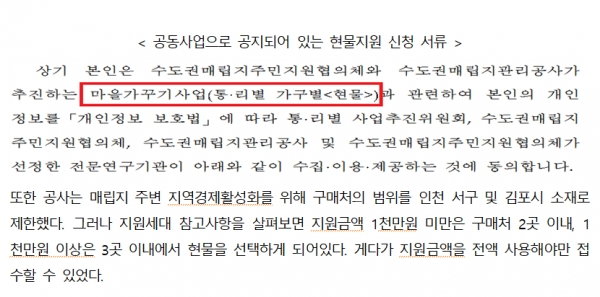 가구별 현물지원 신청 시 제출해야 하는 ‘개인정보 수집·이용 등에 대한 동의서’를 보면 해당사업은 공동사업 범주인 ‘마을가꾸기사업’으로 명기돼 있다. 마을가꾸기 사업의 일환으로 가구별 현물 사업을 진행한 것이다.