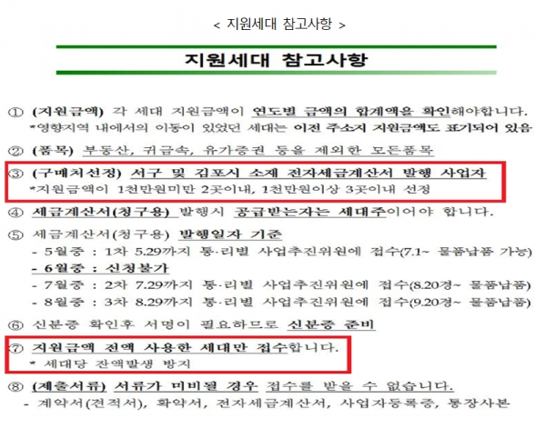 또한 공사는 매립지 주변 지역경제활성화를 위해 구매처의 범위를 인천 서구 및 김포시 소재로 제한했다. 그러나 지원세대 참고사항을 살펴보면 지원금액 1천만원 미만은 구매처 2곳 이내, 1천만원 이상은 3곳 이내에서 현물을 선택하게 되어있다. 게다가 지원금액을 전액 사용해야만 접수할 수 있었다.