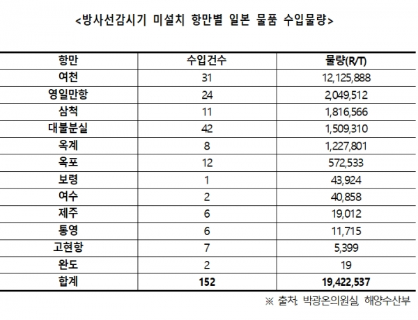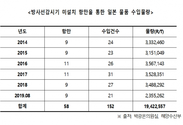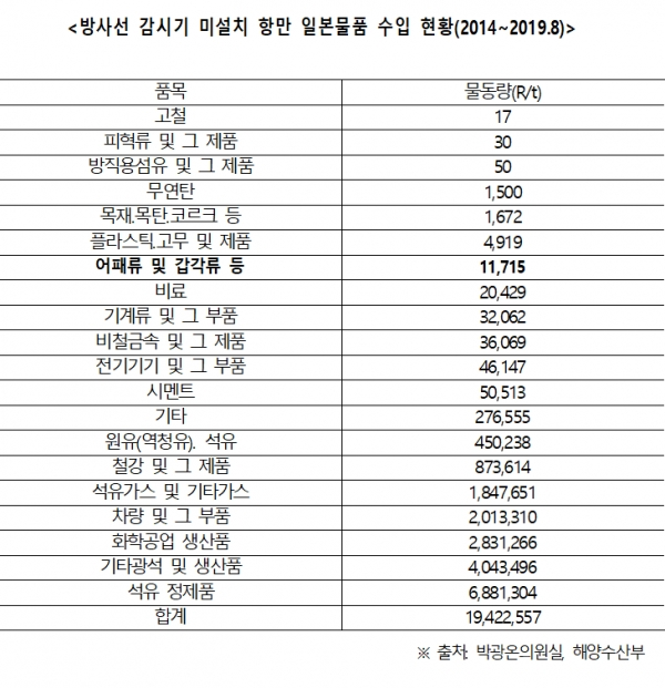 더불어민주당 박광온 의원(국회 과학기술정보방송통신위원회)이 ‘국내 항만별 일본 수입물량’을 분석한 결과 2014년부터 최근 8월말까지 원자력안전위원회의 방사선감시기가 미설치된 항만 12곳을 통해 일본산 기타광석 및 철강제품, 플라스틱 및 고무제품, 어패류, 갑각류 등이 1,942만 2,557R/T(운임톤: 중량톤과 용적톤 중 선사가 선택하는 청구기준 톤)이나 수입된 것으로 나타났다.