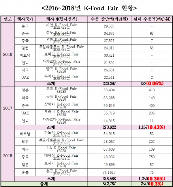 17일 국회 농림축산식품해양수산위원회 소속 김종회 의원(전북 김제·부안)에 따르면 한국농수산식품유통공사(aT)가 지난 2016~2018년 K-Food 박람회를 통해 수출상담액 8400여억 원의 실적을 거뒀다고 홍보 했지만, 실제 수출로 이어진 금액은 25여억 원으로 대외 홍보성 상담액의 0.3% 수준에 불과한 것으로 밝혀졌다. 이는 aT가 K-Food 박람회 성과측정 전문기관을 통해 매년 참가업체를 대상으로 수출 이행현황을 조사한 결과다.