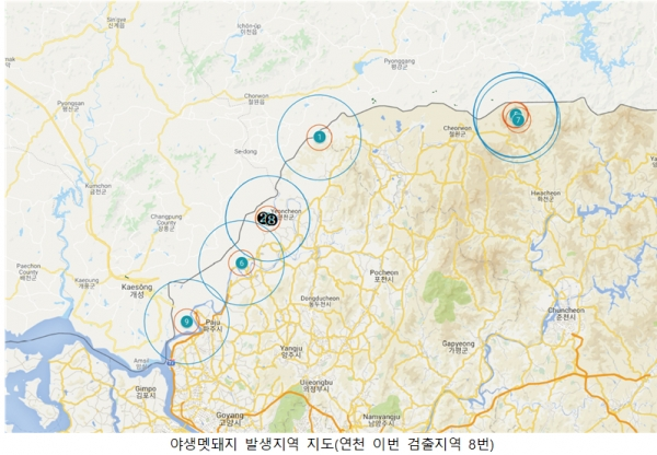 10월 16일 오전 10시 경 민통선 내 감염지역의 멧돼지 이동 차단을 위해 전기울타리 설치작업 중 국립생물자원관 직원 및 군인이 발견하여 연천군으로 신고한 폐사체에서 아프리카돼지열병 바이러스가 검출된 것이다.
