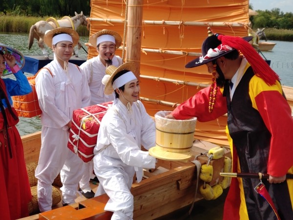 18일 서울 마포구 월드컵공원에서 열린 '제12회 마포나루 새우젓축제'에서 유동균 마포구청장이 마포나루에 도착한 전국 각지에서 온 새우젓을 시식하고 있다.