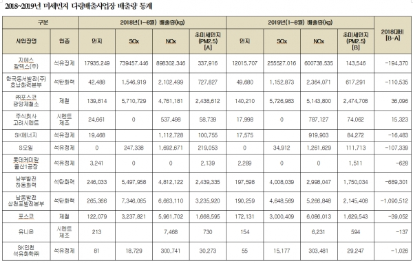 부문별로 가장 많은 감축을 한 업종은 석탄화력발전업으로 11개 사업장이 2019년 1만 1,346톤을 배출해 전년 동기 1만 5,685톤보다 4,339톤(27.6%)을 감축했다. 다음으로 석유정제업 7개 사업장이 423톤을 배출해 351톤(45.3%)을 감축했다. 시멘트제조업 12개 사업장은 3,712톤을 배출해 122톤(3.2%)을 감축했다. 반면 제철업 3개 사업장은 7,541톤을 배출해 11톤이 증가한 것으로 집계됐다.