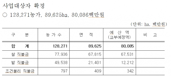 이번에 지급될 직불금은 농가 소득안전 및 식량자급률 등을 위해 법정 요건을 갖추고 농지를 경작 중인 농업인에게 지급되는 보조금이다.