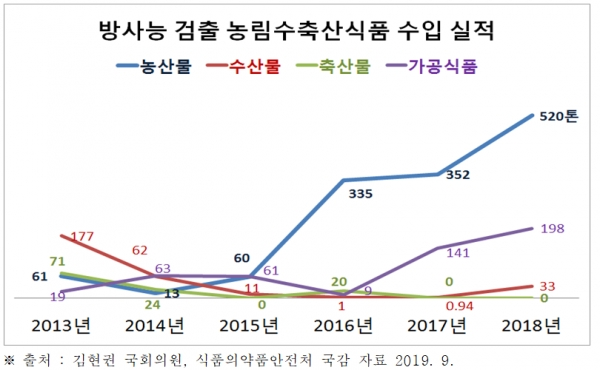 2011년부터 현재까지 방사능이 검출된 농림수축산식품 수입 실적을 살펴보면 농림산물은 매년 늘면서 2018년기준 520톤에 달했다. 가공식품은 2016년 9톤으로까지 줄었다가 2017년 141톤, 2018년 198톤으로 늘고 있다.