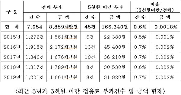 이는 같은 기간 전체 부과건수 7,054건 대비 0.6%, 전체 부과금액 88억 5900만 원 대비 0.0018%에 지나지 않았다.