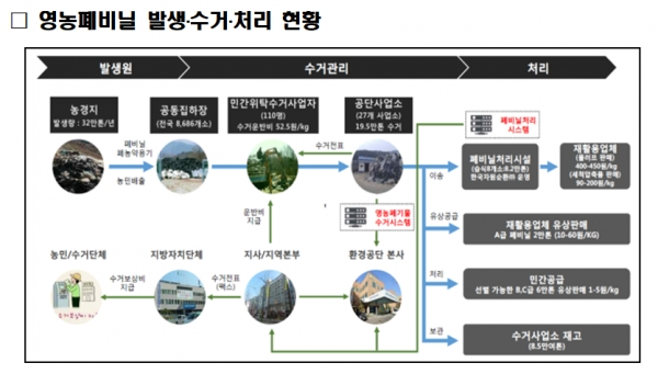 영농폐기물은 사용하고 버려진 폐비닐과 폐농약용기 등이 대부분을 차지한다. 전국적으로 연간 발생하는 폐비닐 약 32만 톤(이물질 포함) 중 약 19%인 6만 톤은 수거되지 못하고 방치되거나 불법으로 소각되고 있는 실정이다. 이로 인해 미세먼지 유발 등 2차 환경오염과 겨울철 산불 발생의 원인이 되고 있다.