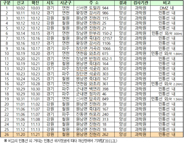 과학원은 정밀분석을 거쳐 11월 21일 오후 12시 경 아프리카돼지열병 바이러스를 최종 확인하고 그 결과를 관계기관에 통보했다. 이로써 철원에서 12번째 아프리카돼지열병 바이러스가 검출됐으며, 전국적으로는 26건으로 늘어났다.