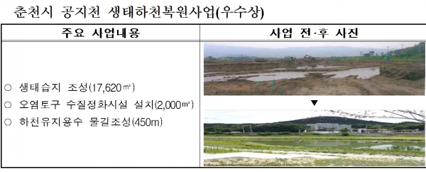 우수상으로 선정된 춘천시 공지천은 유입 지류와 공지천 유역 전체의 수질을 개선하고, 본류와 지류를 연계하는 수생태계를 구축하여 건강성을 회복했다.