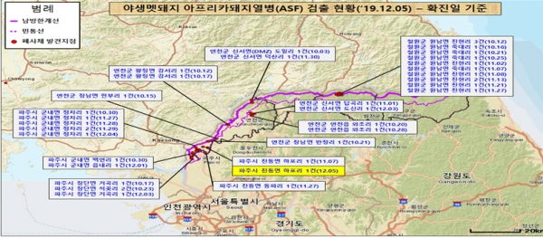 국립환경과학원은 12월 5일 폐사체에서 아프리카돼지열병 바이러스를 확진하고 결과를 관계기관에 통보했다. 파주에서 15번째로 멧돼지 아프리카돼지열병이 확진됐으며, 전국적으로는 38건으로 늘어났다.