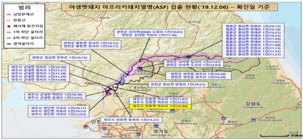 국립환경과학원은 12월 6일 폐사체에서 아프리카돼지열병 바이러스를 확진하고 결과를 관계기관에 통보했다. 파주에서 16번째로 야생멧돼지 아프리카돼지열병이 확진됐으며, 전국적으로는 39건으로 늘어났다.