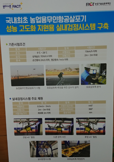 농업기술실용화재단(이사장 박철웅, 이하 재단)은 국내 최초로농업용 무인항공살포기(이하 농업용 드론)의「실내 검정시스템(이하 검정 시스템)」을 구축하였으며, 오는 12.10(화) 오전 10시부터 재단(전북 익산 송학동 소재) 농기계검정동에서 『농업용 무인항공살포기 실내 검정시스템 시연회』를 개최한다고 밝혔다.