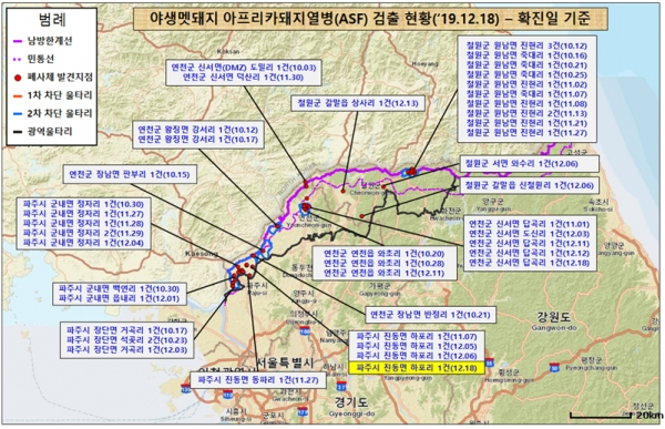 국립환경과학원은 12월 18일 폐사체에서 아프리카돼지열병 바이러스를 확진하고 결과를 관계기관에 통보했다. 파주에서 17건의 야생멧돼지 아프리카돼지열병이 확진됐으며, 전국적으로는 47건이 됐다.