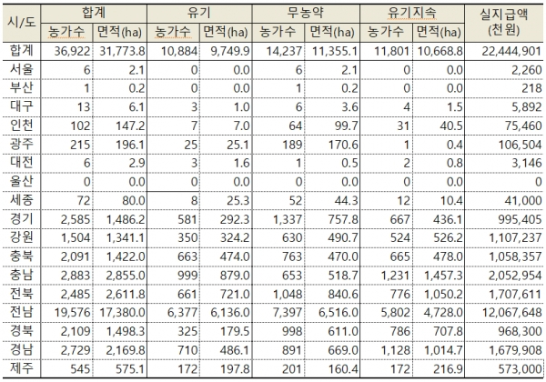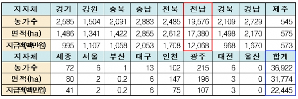 시·도별로는 전남이 121억원(17,380ha)으로 전체 지급액의 53.8%를 차지하는 것으로 나타났다.