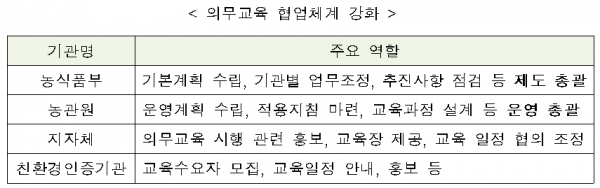 그간 인증농업인 대상 교육은 부정기적이며 단순 전달교육 형식이었으나, 정기적으로 실시되는 의무교육 제도를 통해 친환경농업의 철학과 가치, 변화되는 제도 및 정책 등이 친환경농업 현장에 올바르게 전달되어 정착될 수 있도록 할 계획이다.