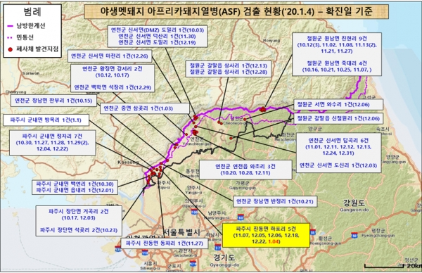 국립환경과학원은 1월 4일 폐사체에서 아프리카돼지열병 바이러스를 확진하고 결과를 관계기관에 통보했다. 파주시에서 21번째로 멧돼지 아프리카돼지열병이 확진됐으며, 전국적으로는 58건이 됐다.