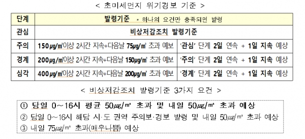 이번 해당지역은 오늘(1월 10일) 0∼16시까지 초미세먼지(PM2.5)의 일평균 농도가 50㎍/㎥를 초과했고, 내일도 50㎍/㎥를 초과할 것으로 예상되어 발령기준을 충족했다.