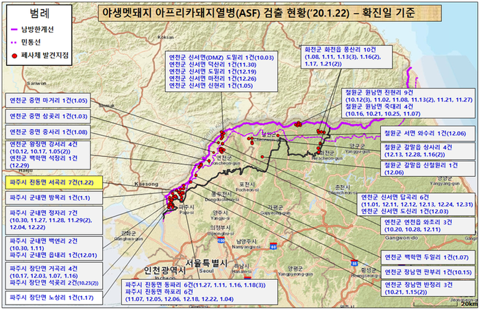 국립환경과학원은 1월 22일 폐사체에서 아프리카돼지열병 바이러스를 확진하고 결과를 관계기관에 통보했다. 이로써 파주시에서는 38건의 야생멧돼지 아프리카돼지열병이 확진됐으며 전국적으로는 95건이 됐다.