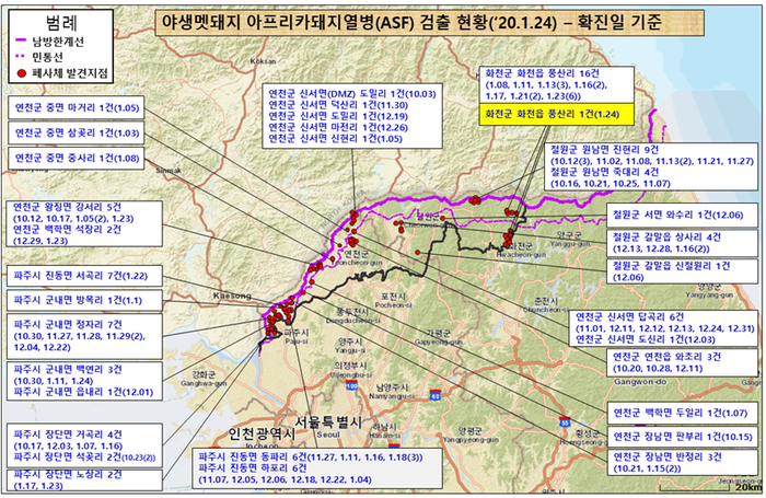 국립환경과학원은 1월 24일 폐사체에서 아프리카돼지열병 바이러스를 확진하고 결과를 관계기관에 통보했다. 이로써 화천군에서는 17건의 야생멧돼지 아프리카돼지열병이 확진됐으며 전국적으로는 106건이 됐다.