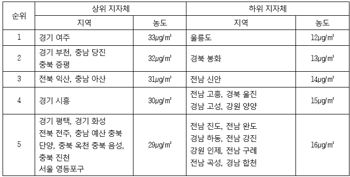 또 기초단체별로는 경기 여주의 지난 해 연평균 PM2.5 농도가 33 ㎍/㎥로 나타나 전국에서 가장 높았으며 , 그 뒤를 이어 경기 부천 , 충남 당진 , 충북 증평 (이상 32 ㎍/㎥), 전북 익산 , 충남 아산 (이상 31 ㎍/㎥), 경기 시흥 (30 ㎍/㎥) 순으로 나타났다 .