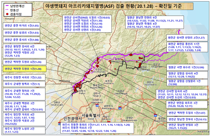 국립환경과학원은 1월 28일 폐사체에서 아프리카돼지열병 바이러스를 확진하고 결과를 관계기관에 통보했다. 이로써 연천군에서는 38건의 야생멧돼지 아프리카돼지열병이 확진됐으며 전국적으로는 118건이 됐다.