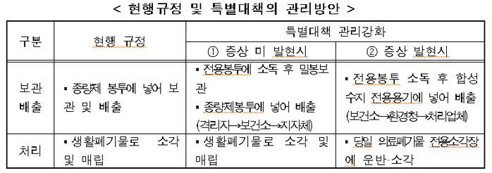 환경부는 올해 1월 20일 최초 확진자 확인 후 관련 폐기물 처리업체에 격리 의료폐기물 처리 시 안전관리를 철저히 하도록 요청하였으며,