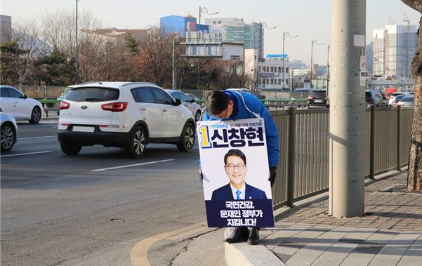 신 후보는 6일 오후, 자신의 선거사무실 앞 대로변에서 “국민건강, 문재인정부가 지킵니다”고 쓴 피켓을 들고 1번 국도를 통과하는 차량들에게 인사하며, 바이러스 확산방지에 최선을 다하고 있는 정부를 신뢰하고 의왕과천 시민들이 한마음으로 극복해 나갈 것을 호소했다.