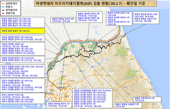 국립환경과학원은 2월 7일 폐사체에서 아프리카돼지열병 바이러스를 확진하고 결과를 관계기관에 통보했다. 이로써 연천군에서는 49건의 야생멧돼지 아프리카돼지열병이 확진됐으며 전국적으로는 170건이 됐다.