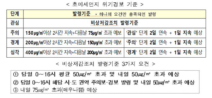 해당지역은 오늘(2월 10일) 0∼16시까지 초미세먼지(PM2.5)의 일평균 농도가 50㎍/㎥를 초과하거나 주의보가 발령됐고, 내일도 일평균 50㎍/㎥를 초과할 것으로 예상되어 발령기준을 충족했다.