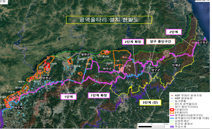 화천에서 양구로 야생멧돼지의 동진을 차단하기 위해 3단계 광역울타리와 남방한계선을 남북으로 연결하는 양구 종단 울타리도 설치한다.