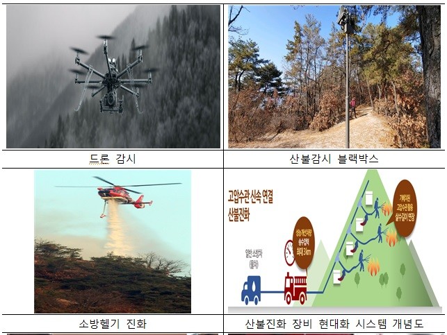 아울러 진화장비의 성능 향상과 개선을 위하여 ▴산불진화차 ▴산불진화기계화시스템 ▴소방차성능개선펌프 ▴고압수관 장비보관함 등 현대화된 지상진화장비를 추가로 확보해 초동진화 기반을 지속적으로 강화할 계획이다.