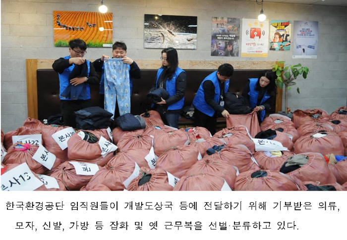 한국환경공단은 1월 28일부터 2월 5일까지 임직원으로부터 의류, 모자, 신발, 가방 등 잡화 4,288개 및 옛 근무복 1,374벌 등 총 5,662개 품목을 기부받았다.