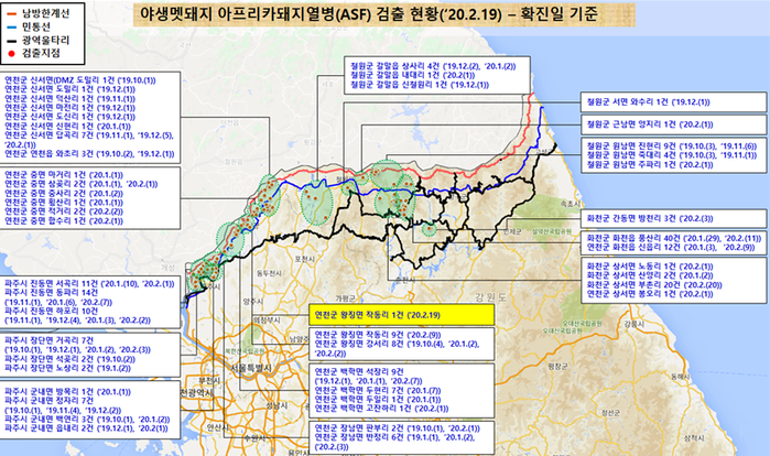 국립환경과학원은 2월 19일 폐사체 1개체에서 아프리카돼지열병 바이러스를 확진하고 결과를 관계기관에 통보했다. 이로써 연천군에서는 ‘19년 10월 3일 최초 검출 이후 현재까지 총 68건의 멧돼지 아프리카돼지열병이 확진됐으며 전국적으로는 229건이 됐다.